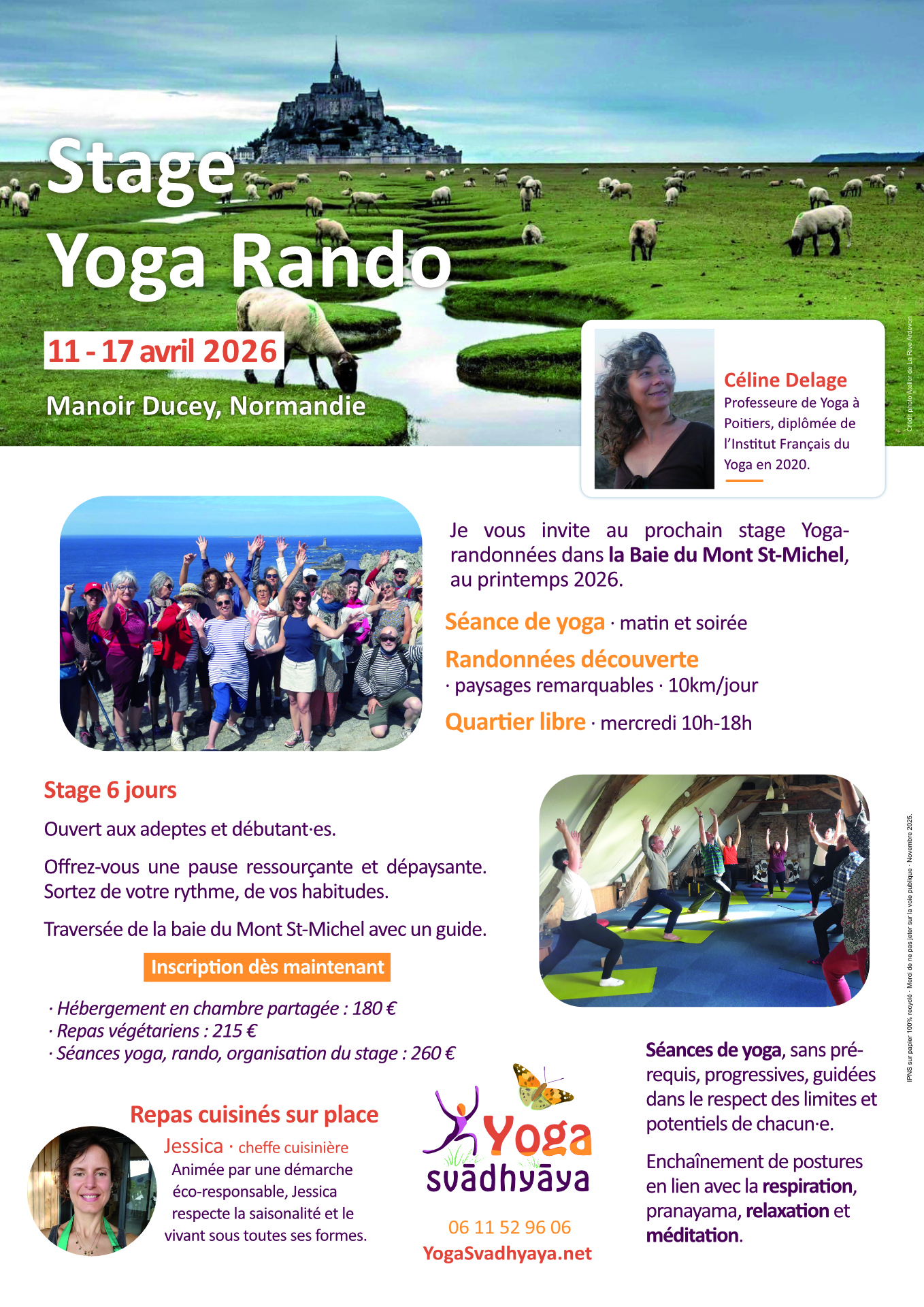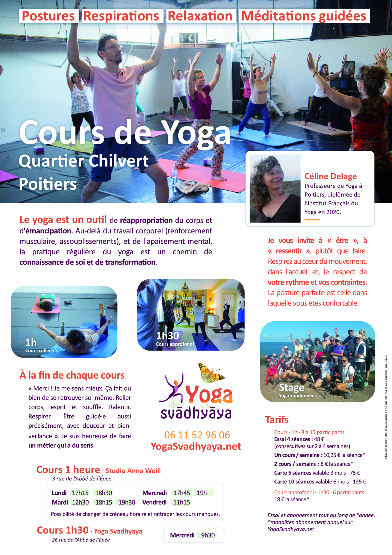 Nouveau visuel qui rassemble les différentes propositions de cours de Yoga Svadhyaya à Poitiers, dans la Vienne et au-delà en stage Yoga randonnées.