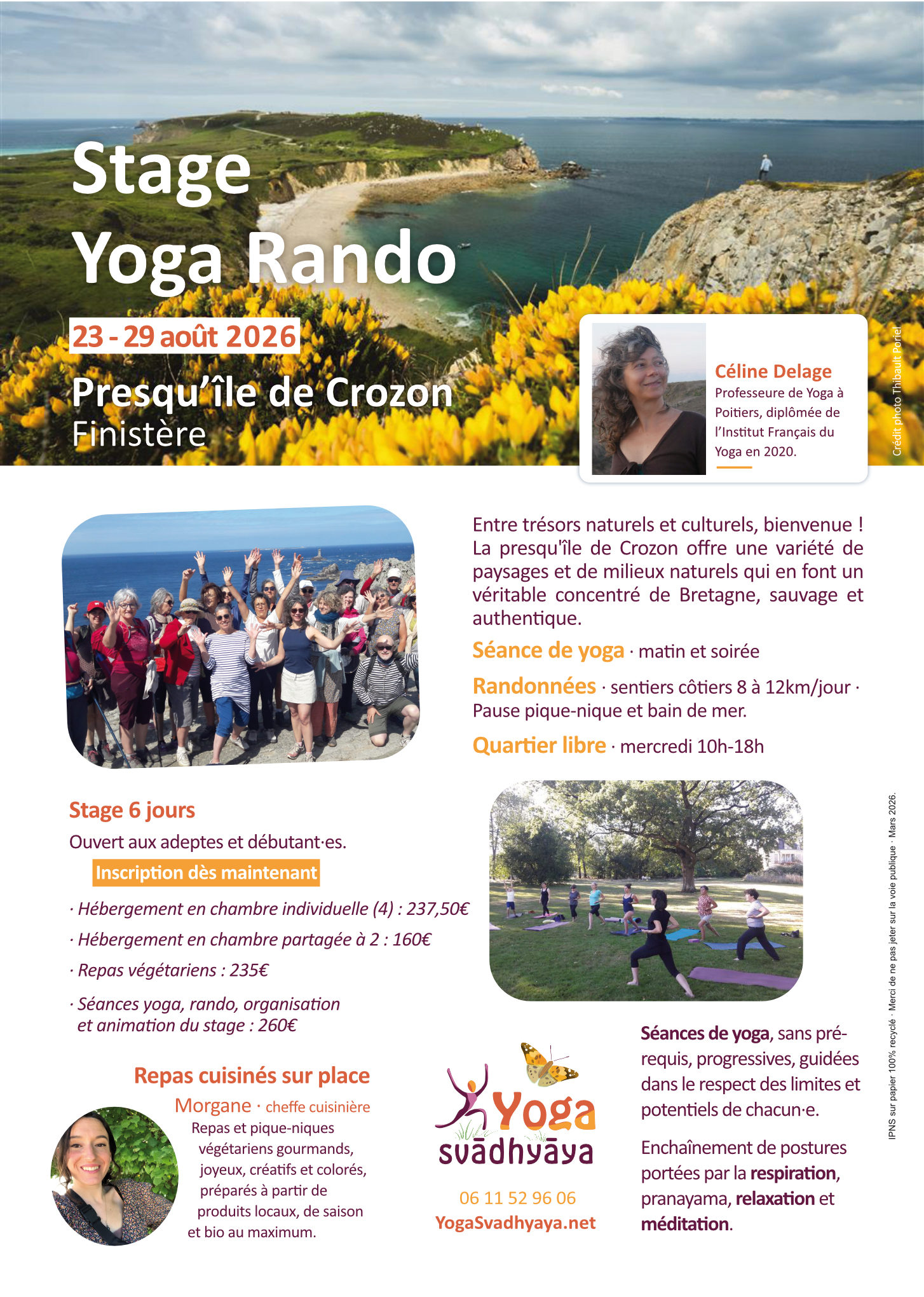 Nouveau visuel qui rassemble les différentes propositions de cours de Yoga Svadhyaya à Poitiers, dans la Vienne et au-delà en stage Yoga randonnées.