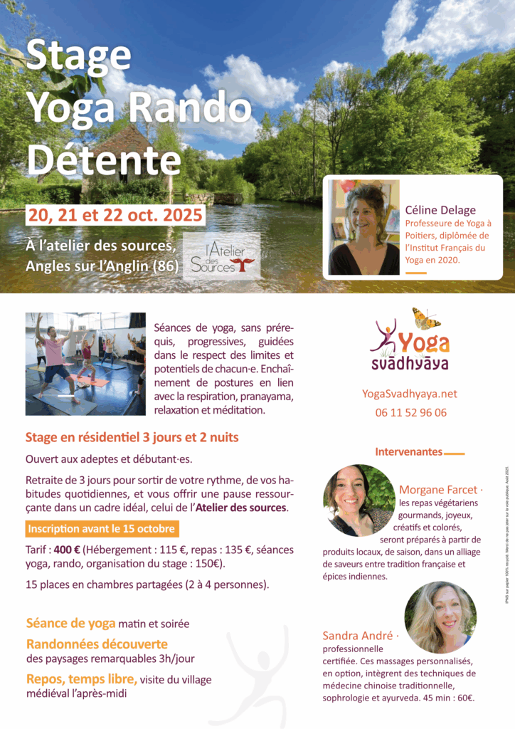 - Séance de yoga d’1h30 matin et soirée : progression dans chaque séance et tout au long du stage